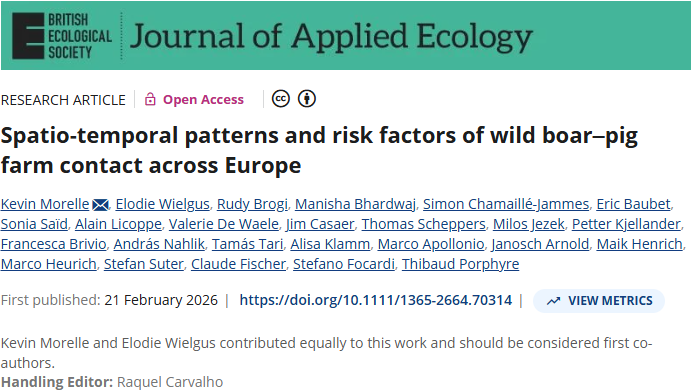 Le Dr. Thibaud Porphyre, épidémiologiste au sein du pôle EVAAS, a publié avec Dr. Kevin Morelle et Dr. Elodie Wielgus, un article dans le volume 63, numéro 2, du Journal of Applied Ecology sur les modèles spatio-temporels et facteurs de risque de contact entre les sangliers et les élevages porcins à travers l’Europe.