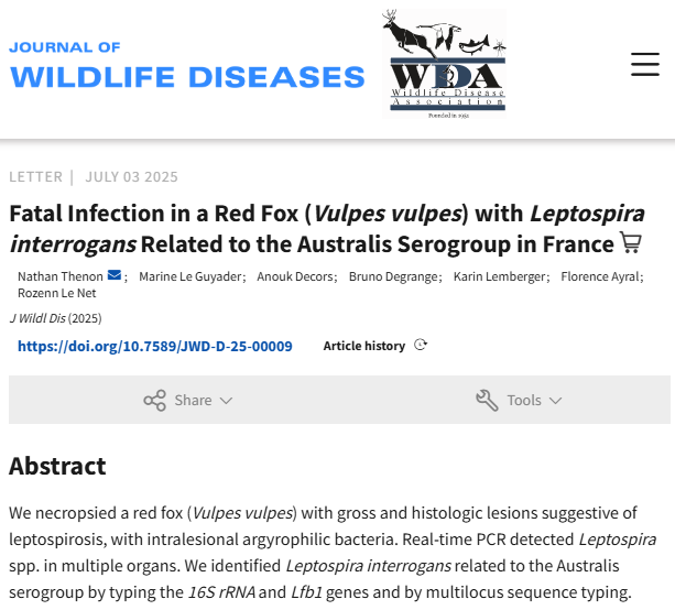 Publication d’un article sur un cas de leptospirose mortelle chez un renard roux en France